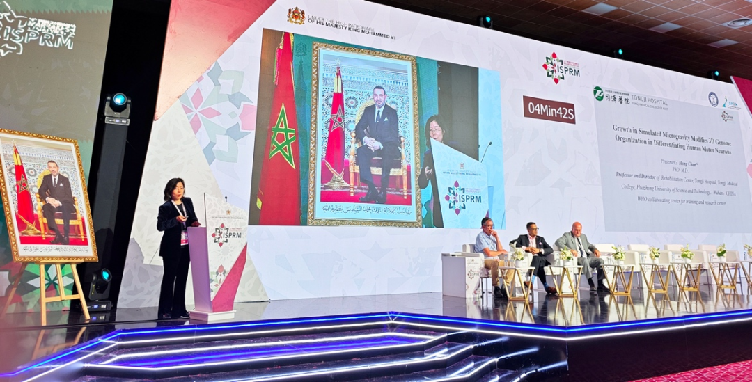 来自华中科技大学同济医学院附属同济医院的代表们展示了神经康复与基础研究的多项前沿成果。陈红教授作大会口头报告,围绕模拟微重力对运动神经元分化过程中三维基因组组织的影响进行了深入解析,展现了团队在神经再生康复方向的原创性发现。康复治疗中心主任陈勇与物理治疗师夏楠分别以壁报形式展示了电针干预脑卒中和声磁耦合配对神经调控的临床观察与技术创新。会议期间,同济团队还并作为世界康复联盟成员参加了ISPRM与WHO联合举办的康复政策专题活动,并与美国物理医学与康复杂志(AJPRM)主编、前ISPRM主席Walter Frontera教授,以及瑞士卢塞恩大学Gerold Stucki教授进行了交流。